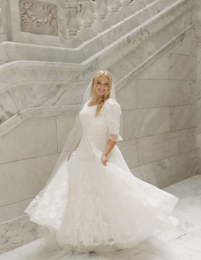 She was able to alter my neckline so that it fit exactly how I needed & did a beautiful job with the bustle — and even made a diagram for those helping me get ready so it was a breeze to get it all pinned up on my wedding day!